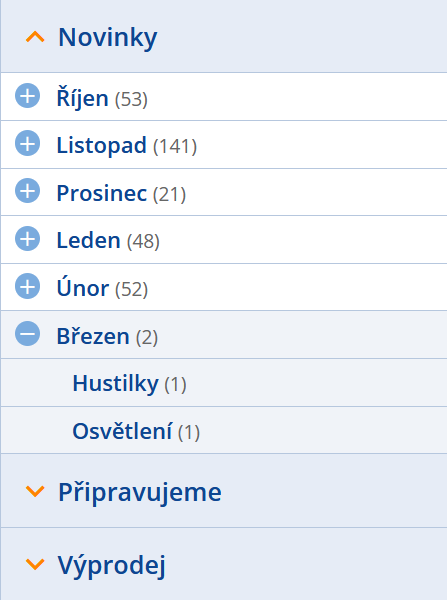 Na úvodní stránce v sekci NOVINKY, PŘIPRAVUJEME a VÝPRODEJ najdete nyní pro větší přehlednost dělení dle měsíců a kategorii.