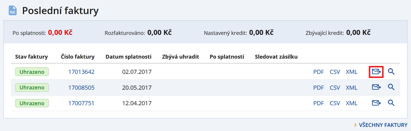 Potřebujete některou z vašich faktur rychle odeslat prostřednictvím mailu, například vaší účetní? Nyní k tomu stačí jen pár kliknutí. Vyberte si v seznamu faktur požadovanou fakturu, kterou chcete odeslat a klikněte na následující ikonku. Poté stačí už jen zadat mailovou adresu a odeslat.