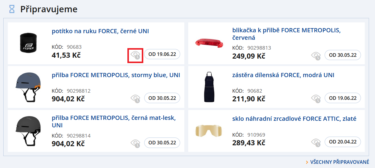 Pokud vás zaujal některý nově připravovaný produkt, ale nechcete stále nosit v hlavě datum naskladnění? V sekci Připravujeme na domovské stránce si můžete nastavit hlídání naskladnění požadovaného produktu a jakmile bude produkt naskladněn, obratem vám přijde e-mail s upozorněním.