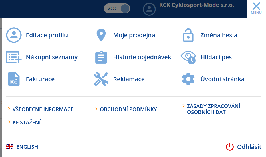 Veškeré informace o vašem účtu naleznete nově v MENU, které se nachází v horní liště vedle názvu vašeho uživatelského účtu.