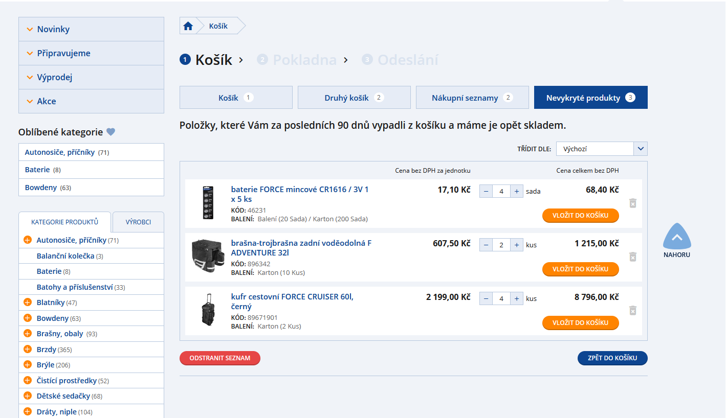 Stává se vám, že vám zboží z košíku zmizí dřív, než stihnete zboží objednat? Právě pro tyto případy jsme vymysleli záložku Nevykryté produkty. Najdete zde všechny položky, které vám za posledních 90 dní vypadly z košíku a jsou opět naskladněny. Nemusíte si tak toto zboží nikam zapisovat, my to uděláme za vás.