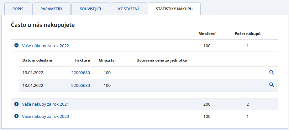 Do detailu produktu se dostanete jednoduše, a to kliknutím na název nebo obrázek vybraného zboží. V detailu produktu naleznete další dodatečné informace, materiály ke stažení, související produkty a také statistiky nákupu. A co nám vlastně statistiky nákupů říkají? Přehledně a rychle vám ukážou, jak často a v jakém množství jste daný produkt nakupovali v minulosti.