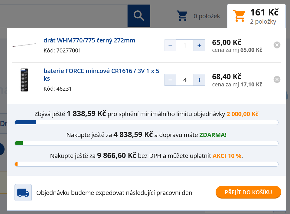 Po najetí myši na aktivní košík se vám zobrazí náhled na obsah košíku. Máte tak okamžitý přehled a veškeré potřebné informace pro splnění minimálního limitu objednávky, zbývajícího množství zboží pro dopravu zdarma či pro uplatnění AKCE 10 %. Hned také uvidíte, kdy bude vaše objednávka expedována.